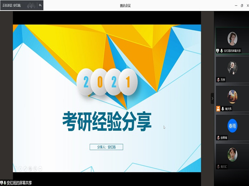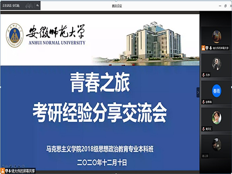 本网讯(文/图 方序)为激发班级同学学习热情,提高考研认识,明确考研目的和考研方向,12月10日晚7点,beet3652018级思想政治教育专业以腾讯会议网络平台为依托,举办了“青春之旅之考研经验分享交流会”活动。本次交流会特邀2016级思想政治教育专业本科生安红旸担任主讲。
