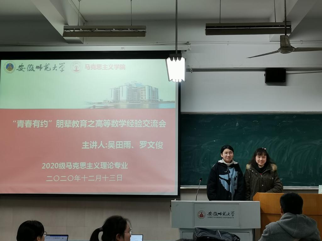 本网讯(文/摄 刘倩倩)为了提高2020级马克思主义理论专业同学们学习高数的兴趣和信心,掌握学习高数的方法,12月13日,夏盼盼老师特别邀请了19级法学一班的吴田雨学姐和19级卓越司法班的罗文俊学姐为同学们讲解学习高数的心得,全体2020级马克思主义理论专业新生参加。