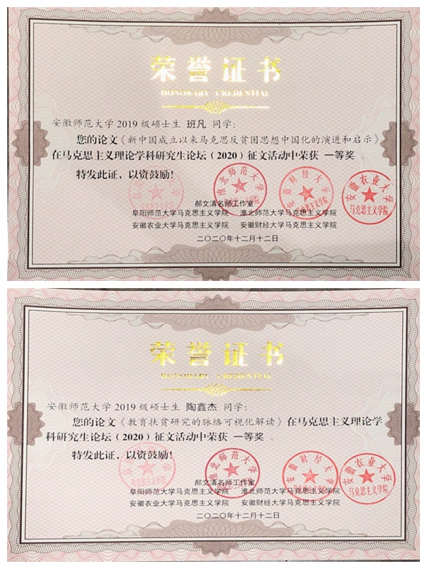 会议共收到来自北京大学、复旦大学、北京科技大学等国内知名高校的博硕研究生论文379篇,其中博士论文60篇,硕士论文319篇。经过形式审查、专家评审、会议评审等环节,最终评出一、二、三等奖和优秀奖。最终公司2019级思想政治教育专业硕士研究生陶鑫杰同学和2019级马克思主义中国化研究专业班凡同学都分别荣获一等奖。
