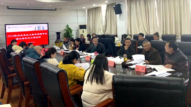 答辩会伊始,本学位点马克思主义基本原理方向负责人汪盛玉教授向大家介绍了答辩主席张艳涛教授,并对张教授在百忙之中抽出时间莅临本院指导预答辩工作表示感谢。接着,参与答辩的9位同学分别就论文《恩格斯劳动正义思想研究》、《李达的马克思主义理论教育观及其当代价值》、《冯契政治哲学思想研究》、《毛泽东延安时期思想政治教育观研究》、《列宁制度正义思想研究》、《以社会主义核心价值观引领网络空间命运共同体建构》、《大卫·哈维新自由主义批判理论的研究与反思》、《艾思奇对马克思主义哲学中国化的贡献研究——以<大众哲学>为中心的考察》、《马克思机器观及其当代价值研究》做陈述汇报。他们分别从选题依据、主要内容、论文创新之处与不足之处等方面进行了较为详细的汇报。随后,老师们分别从论文选题理论性、研究思路创新性、内容结构逻辑性、参考文献规范性等方面对每位同学的文章进行了点评,并针对不足之处提出了具体的修改意见与建议。在导师组各位导师以及学位点每位同学的高度重视和精心筹备下,本次预答辩工作持续四个多小时顺利完成。答辩会结束前,汪盛玉教授对本次预答辩汇报会做了总结性发言,希望每位同学积极与导师沟通交流,并认真消化老师们提出的意见与建议,然后充分利用春节前的寒假时间完成毕业论文的修改和完善。
