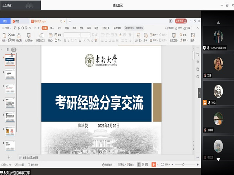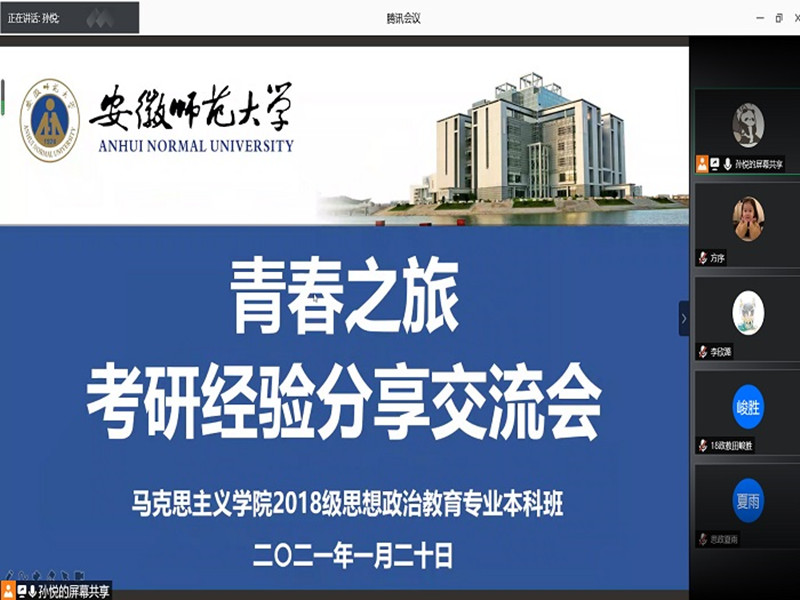 本网讯(文/图 方序)为进一步明确考研目标、提高考研认识、了解考研信息,1月20日晚7点,2018级思想政治教育专业以腾讯会议网络平台为依托,举办了“青春之旅之考研经验分享交流会”。本次交流会特邀2016级思想政治教育专业本科生郑冰悦担任主讲人。