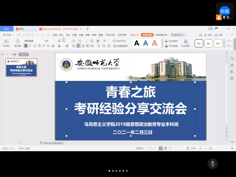 本网讯(文/图 郑婧妍)为了进一步促进员工对考研信息的了解以及考研目标的确立,2月3日晚,2018级思想政治教育专业开展“青春之旅之考研经验分享交流会”。本次会议由18政教班委郑雨嫣主持,邀请到2015级思想政治教育专业毕业生方亚玲分享考研经验,18政教全体员工参加。
