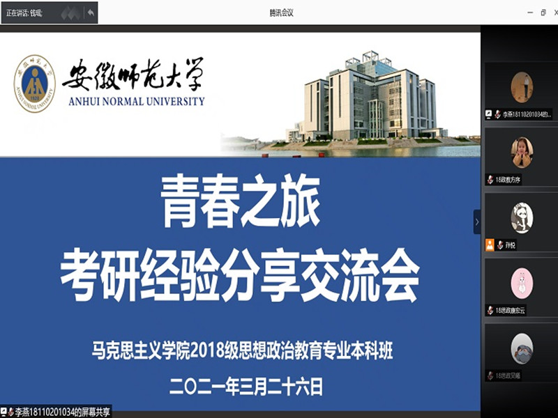 本网讯(文/图 方序),3月26日19点, 2018级思想政治教育专业以腾讯会议网络平台为依托,举办了 “青春之旅之考研经验分享交流会”。本次交流会特邀2016级思想政治教育专业本科生钱瑶担任主讲人。