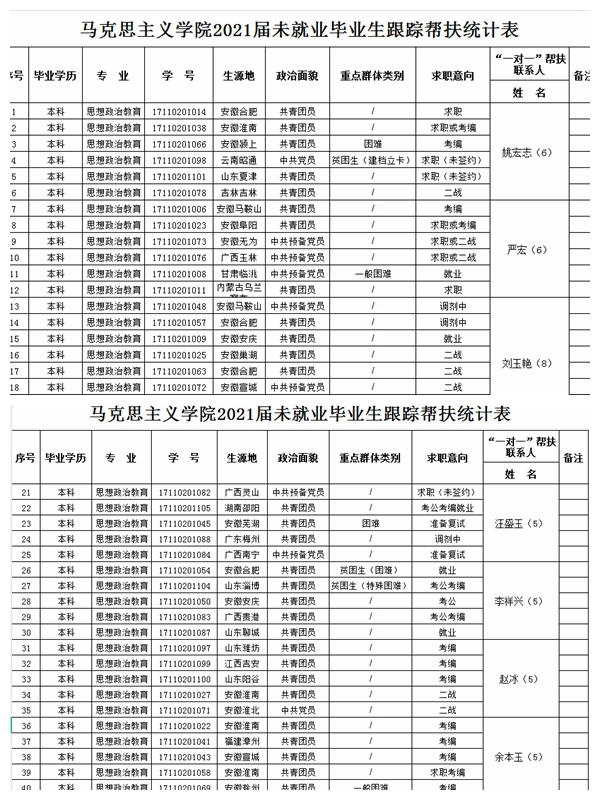落实结对帮扶,促进高质量就业。准确掌握家庭困难特别是建档立卡贫困家庭毕业生,以及少数民族、农村生源等毕业生的具体情况,实行“一生一策”动态管理,做好个性化指导和岗位推荐,为家庭经济困难和就业困难的“双困”毕业生提供多种形式的人文关怀、经济援助,力争帮助更多毕业生在离校前落实就业岗位。就业工作领导组成员深入班级,开展一对一就业帮扶指导活动,跟踪未就业员工就业状况。保研和工作的员工骨干积极成立志愿服务小组,对未就业毕业生的个人情况、就业意向、求职现状等情况进行摸底和调研,利用多种方式、多种途径确保第一时间将就业信息通知到每一位毕业生。