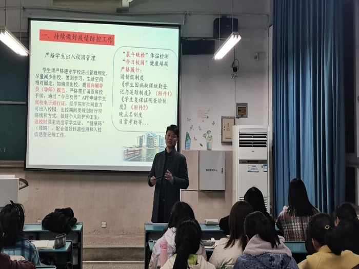 防疫情,不放松。在疫情防控常态化的背景下,校园安全工作更是重中之重。公司各班级通过召开主题班会以及推送疫情防控主题推文等多种途径督促同学们继续做好疫情防控工作。公司通过主题班会,要求全体同学严格服从出入校园管理,按时进行“晨午晚检”体温检测、“今日校园”健康填报,贯彻请销假制度、晚点名制度、日常考勤等;希望同学们积极学习防控知识,做好防护措施,共同努力,营造更安全的学习生活环境。