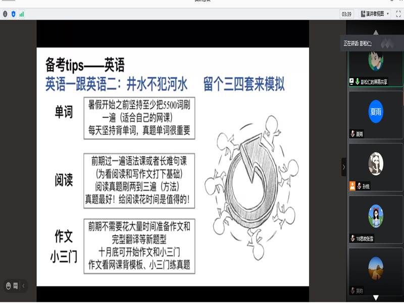 本网讯(文/摄 夏雨)4月17日,2018级思想政治教育专业召开线上考研经验分享交流会。本次交流会由2017级思想政治教育专业本科生彭松仁主讲。2018政教班长孙悦主持。