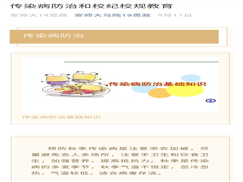 各年级、班级积极进行搬迁宿舍,在集体劳动中互帮互助、团结协作,增进彼此感情、增强班级凝聚力,促进宿舍搬迁圆满完成。在日常卫生打扫中,各年级、班级严格进行教室卫生清扫、宿舍打扫,公司还成立院员工会文明督查小组对安全卫生进行常态化督查,真正做到全覆盖、无遗漏、零死角,营造了整洁干净的学习、生活环境。19政教微信公众号还推送传染病防治相关内容,引导员工养成良好的卫生习惯和生活习惯,进一步巩固新冠肺炎疫情防控成果,从源头上控制疾病的发生与传播。