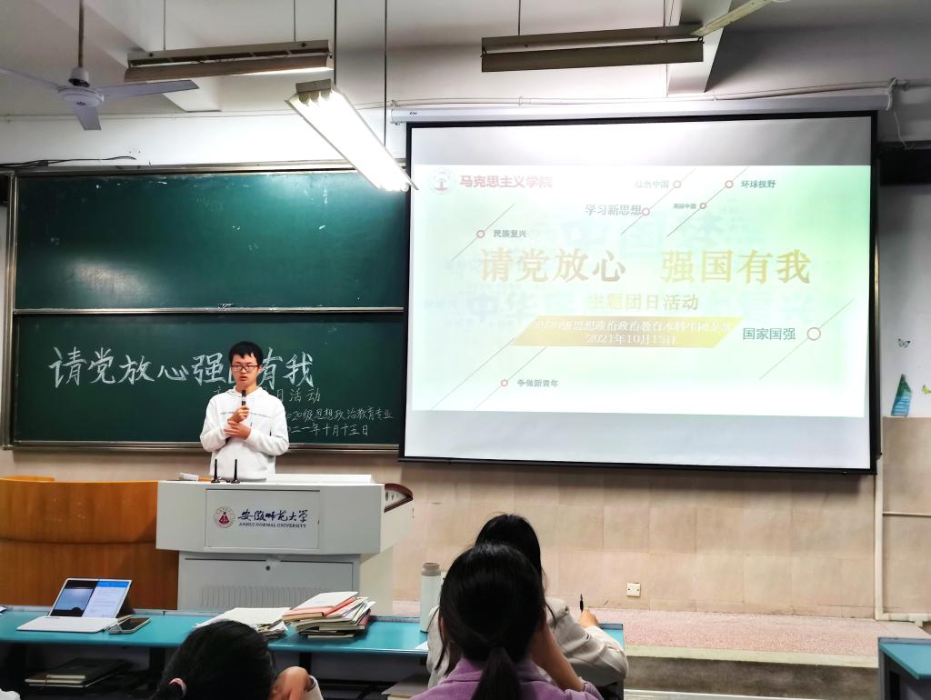 本网讯(文/方乙婷 摄/马雅芸) 为学习宣传习近平总书记“七一”重要讲话精神,凝聚奋斗朝气、激发奋斗精神,2020级思想政治教育专业于10月15日在行知楼2020203教室召开了“请党放心,强国有我”主题团日活动。本次活动由杨占婕与周勤松两位团支书主持,20级思想政治教育专业全体员工共同参加。