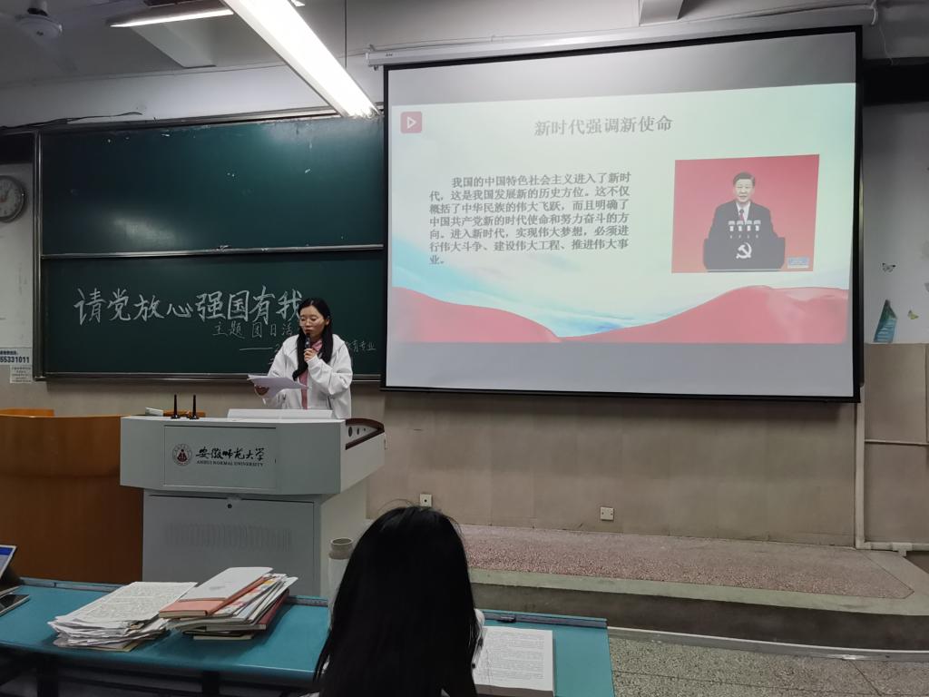 此次主题团日活动介绍了当下的时代背景,回顾了波澜壮阔的党史,重温了慷慨激昂的宣誓,不仅激发了同学们的爱国情怀,学习传承中国共产党人的伟大精神,还使同学们懂得了身为当代青年的责任和使命,引导我们用实际行动践行“请党放心,强国有我”的铮铮誓言.