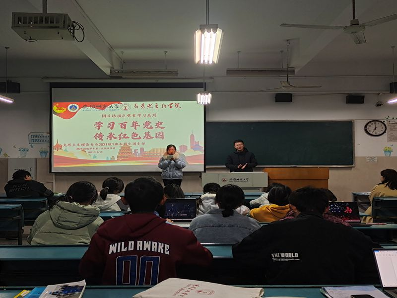 本网讯(文/摄 裴涵悦)百年党史路,奋进新征程,11月10日,21级马克思主义理论1班开展“学习百年党史,传承红色基因”主题团日活动,马克思主义理论1班全体员工到会参加,活动由由薛天然,熊飞翔主持,辅导员沈镇老师到会指导,思政专业部分团干代表到会观摩。