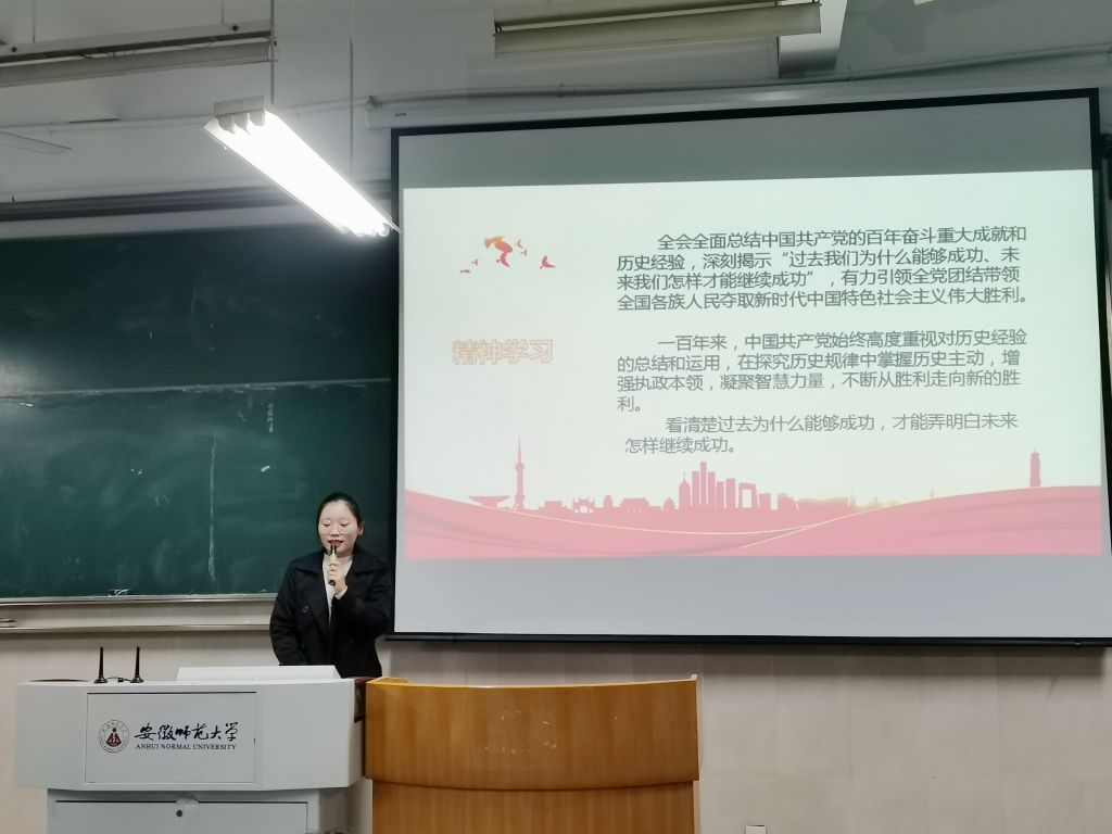 本次活动由团支书周勤松主持。辅导员夏盼盼老师先向全体同学强调了本次主题团课学习的重要性,要求同学们认真深入学习全会精神,并将这种精神贯彻学习生活之中。周勤松带领同学们初步了解中国共产党第十九届六中全会召开基本情况。团支书杨占婕领学了《中共中央关于党的百年奋斗重大成就和历史经验的决议》。同学们深入学习全会精神并积极分享学习体悟。