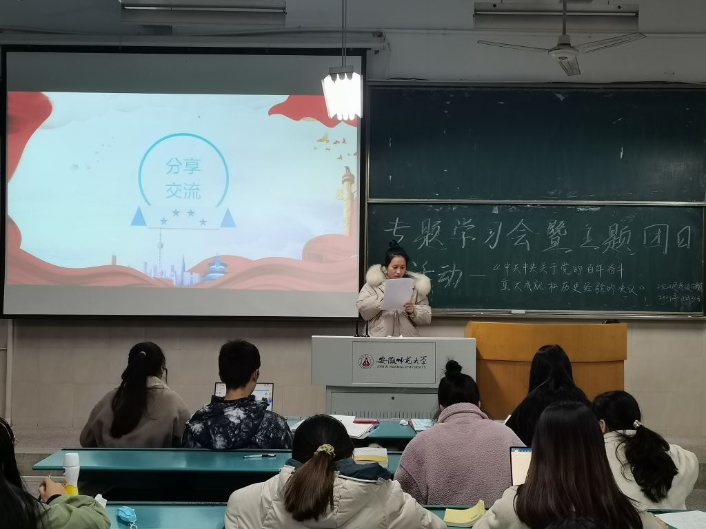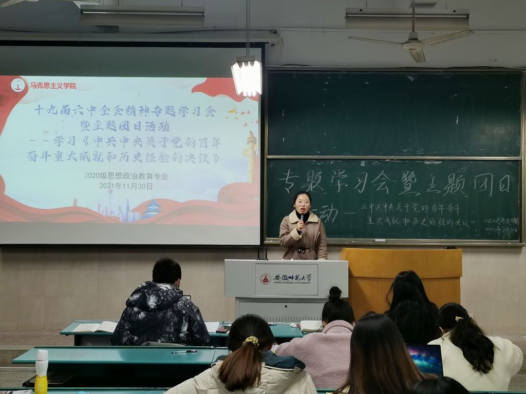 本网讯(文/方乙婷 摄/马雅芸) 11月30日,20级思想政治教育专业全体同学在行知楼2020204教室举办十九届六中全会精神专题学习会暨主题团日活动——学习《中共中央关于党的百年奋斗重大成就和历史经验的决议》。