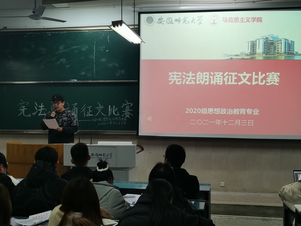 本网讯(文/摄 马雅芸)为提升20级思想政治教育专业员工法律知识素养,推进同学们学宪法、讲宪法,12月3日晚19:30于行知楼2020203教室举办“风华台上碰撞展锋芒,政教学子妙语朗哲思”主题征文朗诵比赛,本次活动由薛韩冰同学主持,评委组成员有公司团委副书记昂昭玉学姐、徐超学长以及研究生会主席张田祥学长,班级评审团有程俊伟、乔婷婷、汪乐怡、傅予、张文豪5位同学组成。