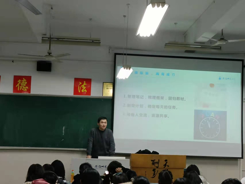李勇超从即将到来的英语四级考试讲起,讲述了一些考四级的技巧,比如写题的顺序、考试的心态、时间的分配等。建议大家读一些英文的文章,把单词放在特定的语境进行记忆,不能看成独立的个体。黄博文根据自己以往期末考试的经验,告诉大家自己的答题方法、技巧,考试前复习要有计划,划重点复习。以老员工思想道德修养为例,要认真对待考试,了解对应学科的性质、特点,有步骤、有目的地加以复习。时可从马克思主义哲学、逻辑学、法学概论等专业课如何答题、熟悉题型等方面介绍考试的具体过程。让同学们了解学情,不要焦虑。此外,三位学长学姐还介绍到关于保研的相关内容和要求,激励同学们努力学习。