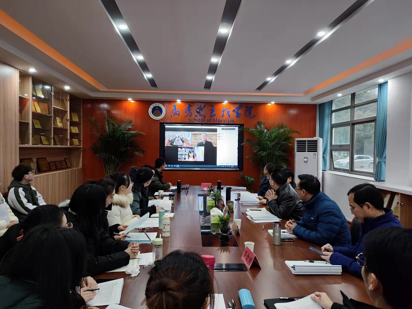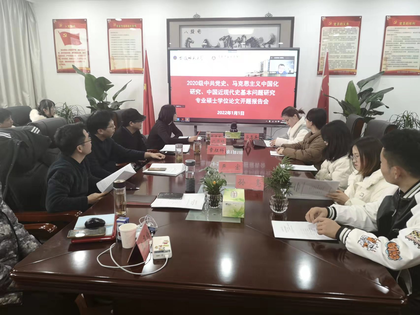 本网讯(文/周晏 摄/王艺潼、周晏、麦琪琪)1月1日上午,2020级中共党史、马克思主义中国化研究、中国近现代史基本问题研究专业硕士学位论文开题报告会顺利举行。此次汇报采取线上与线下相结合的方式,分为三个小组在公司行政楼一楼会议室、三楼培训研修中心和四楼第二会议室举行。分别邀请了南京信息工程大学蒋明敏教授、南京医科大学陶林教授和华中师范大学吕惠东副教授担任报告会组长,三个学位点导师担任报告会组员,2020级三个方向所有员工参加了开题报告会,2021级同学参加观摩学习。