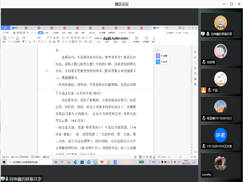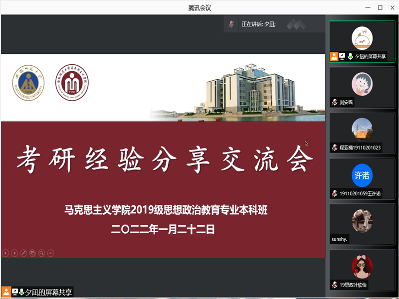 本网讯(文/摄 刘安瑶)1月22日晚,2019级思想政治教育专业在线上举办了考研经验分享交流会活动,本次交流会由班长黄博文主持,2017级本科毕业生华中师范大学刘坤鑫和苏州大学孙敏应邀主讲,19政教全体本科生参加。