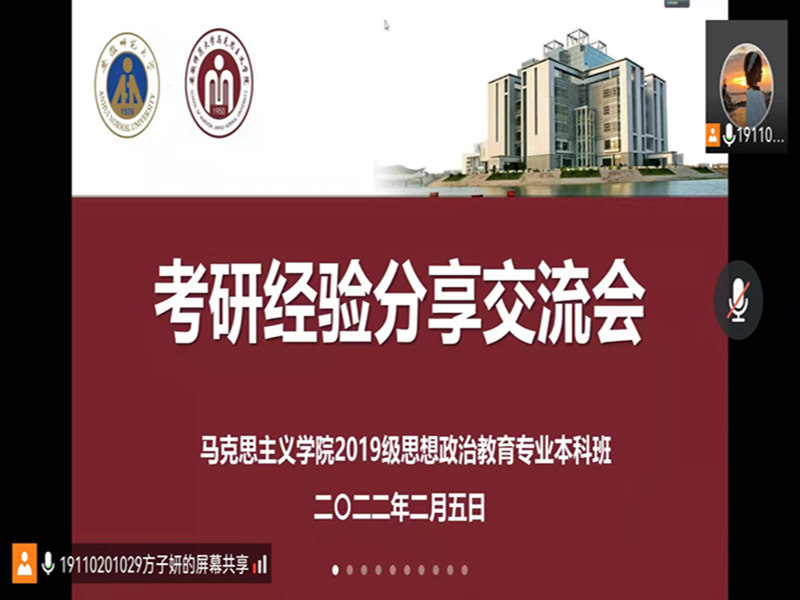 本网讯(文/摄 徐思颖)2月5日晚,2019级思想政治教育专业举办了第三期考研经验分享线上交流会,本次交流会由学习委员方子妍主持,2017级本科毕业生东南大学冯媛和彭松仁应邀主讲,19政教全体本科生参加。