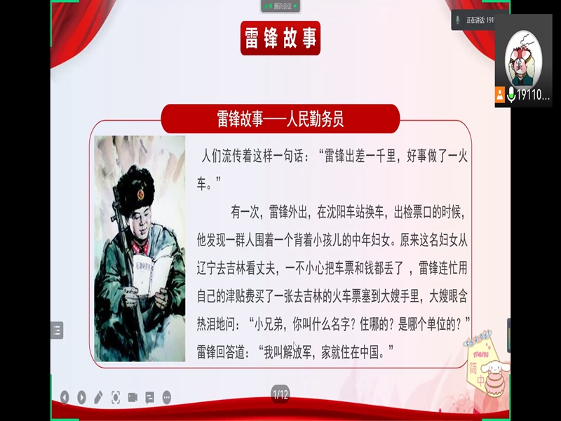 会上,丁小羽简单介绍了雷锋的生平以及为人民服务的事迹。雷锋于1960年参加人民解放军,并于1962年因公殉职,享年22岁。雷锋曾说:“我要坚决做到头可断,血可流,在敌人面前决不屈服、投降……把我可爱的青春献给祖国最壮丽的事业。”雷锋乐于助人,爱国爱党,无私奉献的精神感动了部队里的战士、乡亲民众,也让同学们感触颇深。