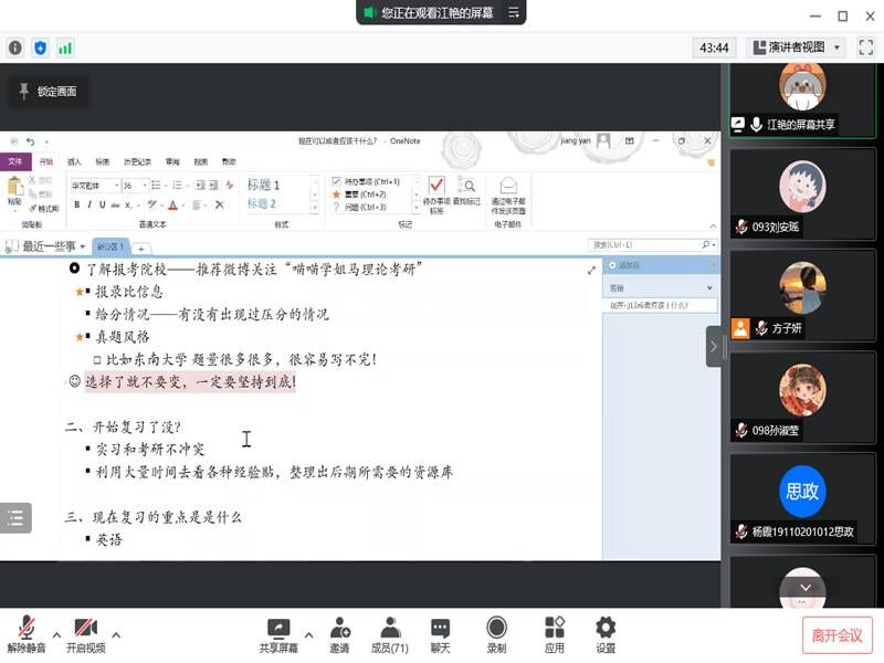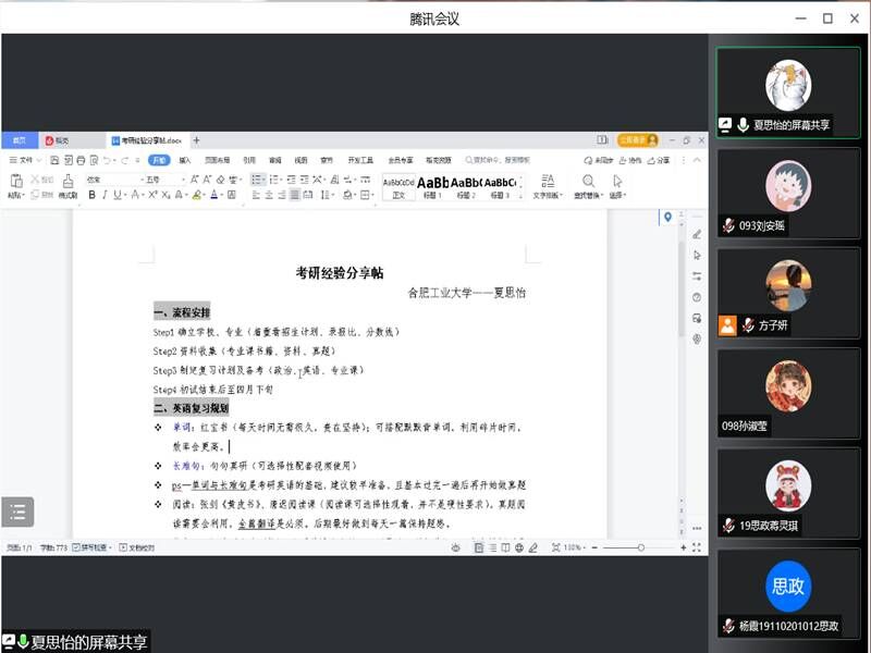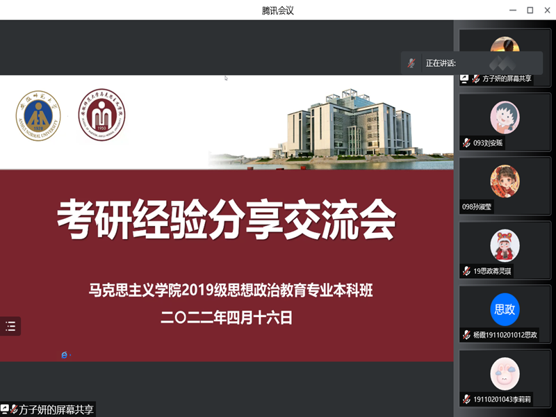 本网讯(文/摄 刘安瑶)4月16日晚,2019级思想政治教育专业举办了第七期考研经验分享线上交流会。本次交流会由学习委员方子妍主持,已被合肥工业大学录取的2018级本科生夏思怡和已被东南大学录取的2018级本科生江艳应邀主讲,19政教全体本科生参加。