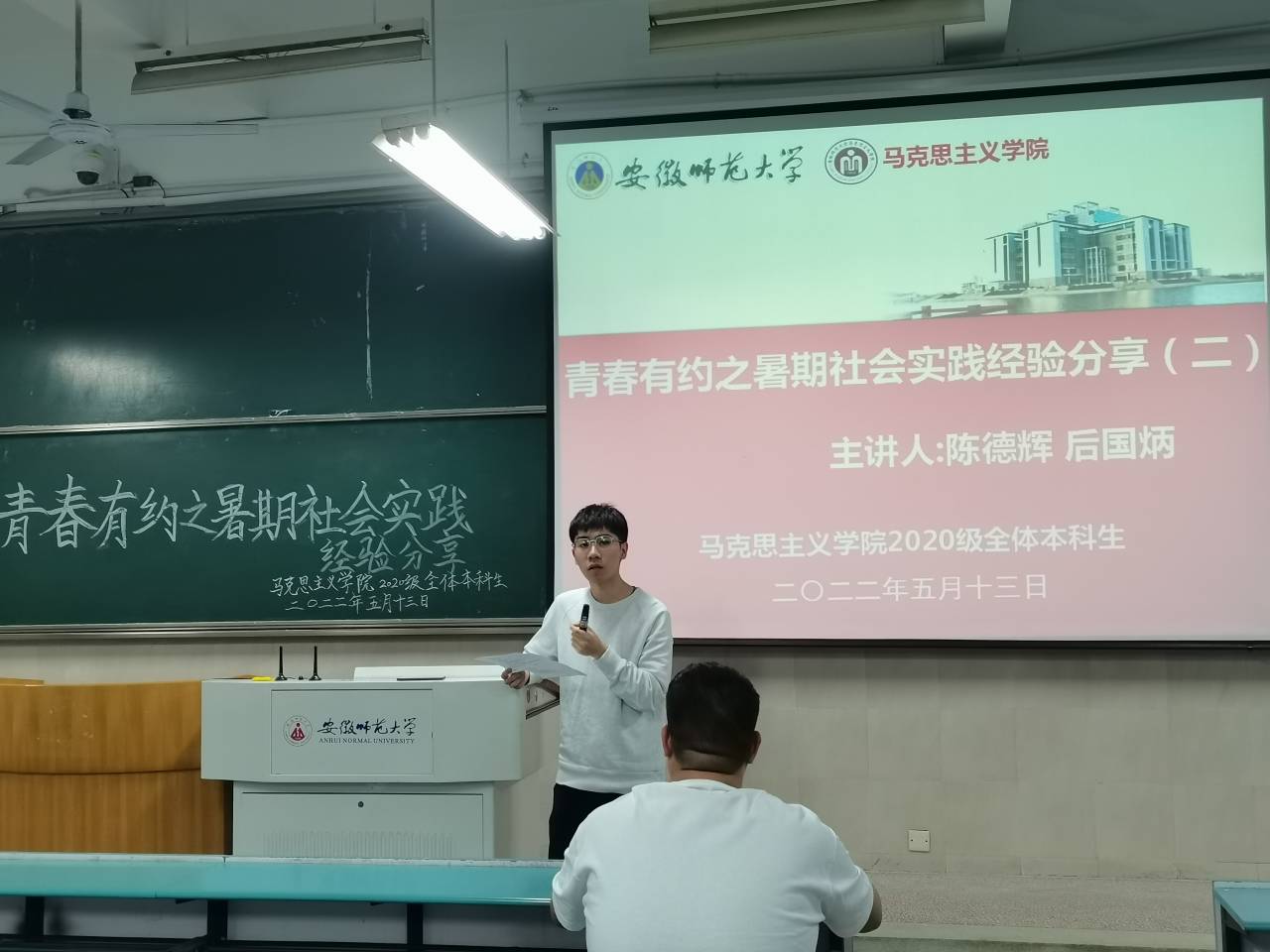 本网讯(文/刘倩倩 摄/方乙婷)5月13日晚,beet365在行知楼2020203开展“青春有约”暑期社会实践经验交流会。本次交流会由花群雨同学主持,特邀18级思政专业的后国炳学长和陈德辉学长进行经验分享。