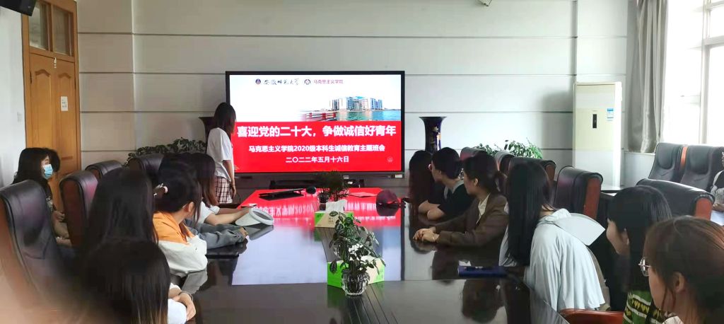 本网讯(文/摄 乔婷婷)5月16日上午,2020级全体贫困生在公司四楼第一会议室召开“喜迎党的二十大,争做诚信好青年”诚信教育主题班会。本次班会由2020级马克思主义理论专业团支书张子璇主讲,20级辅导员夏盼盼老师以及20级全体受助员工参加。
