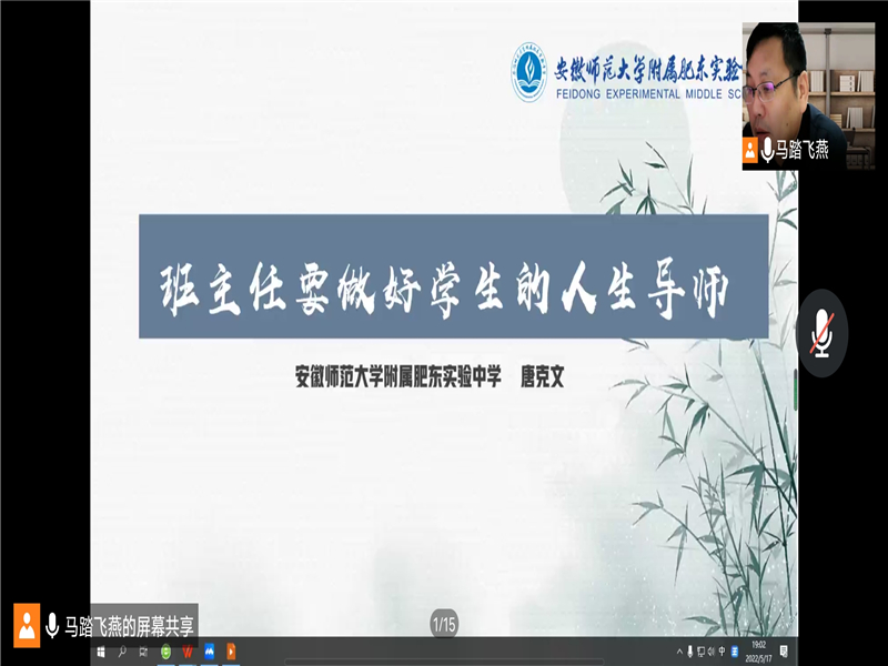 为增强实习员工对班主任工作的认识,5月17日晚,公司举办班主任工作一线专家线上讲座,beet365官方网站附属肥东实验中学董事长唐克文应邀主讲,讲座由陶永华教授主持,中学一线教师和19政教全体本科生共计190余人参加。