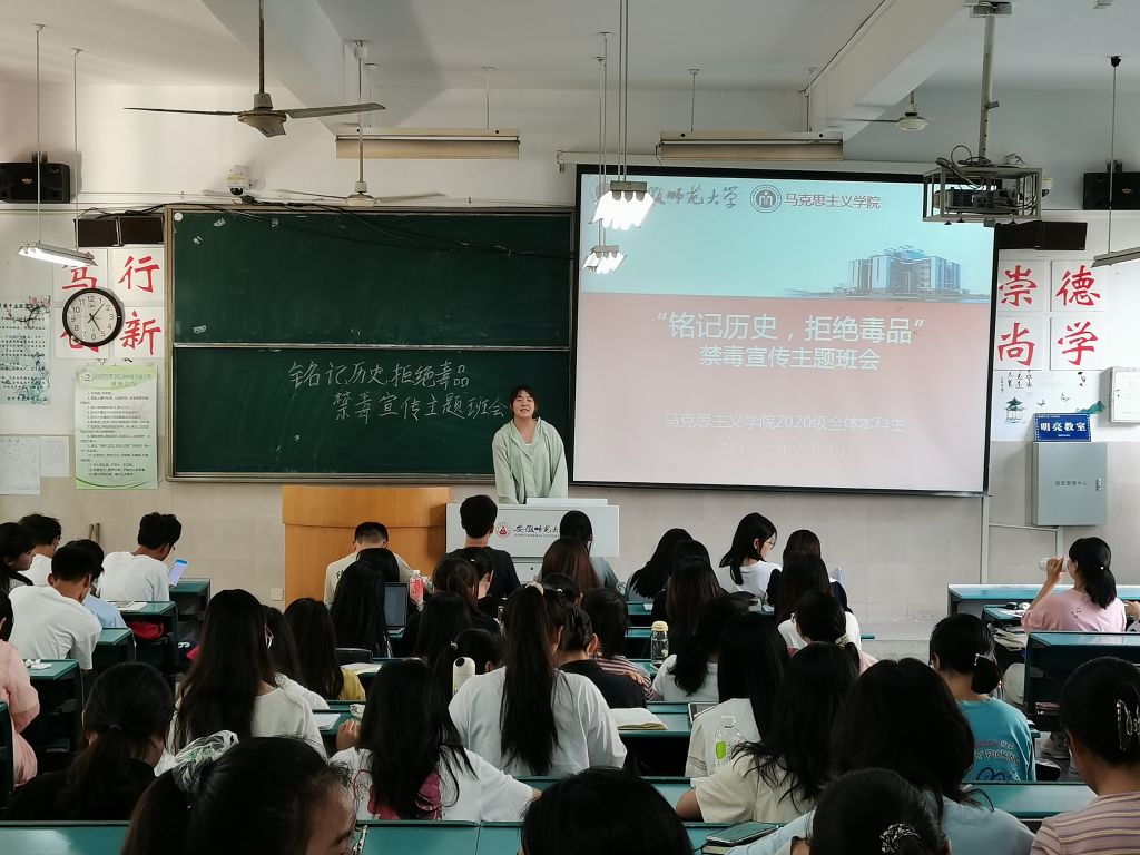 在国际禁毒日到来之际,为响应共青团号召,科学普及禁毒知识,引导同学们珍爱生命、远离毒品,构建安全和谐的校园环境,6月10日下午,公司2020级全体本科生在行知楼2020301教室开展了一次主题为“铭记历史,拒绝毒品”的禁毒宣传主题班会。此次活动由谢颖婕同学主持,20级全体本科生参加。