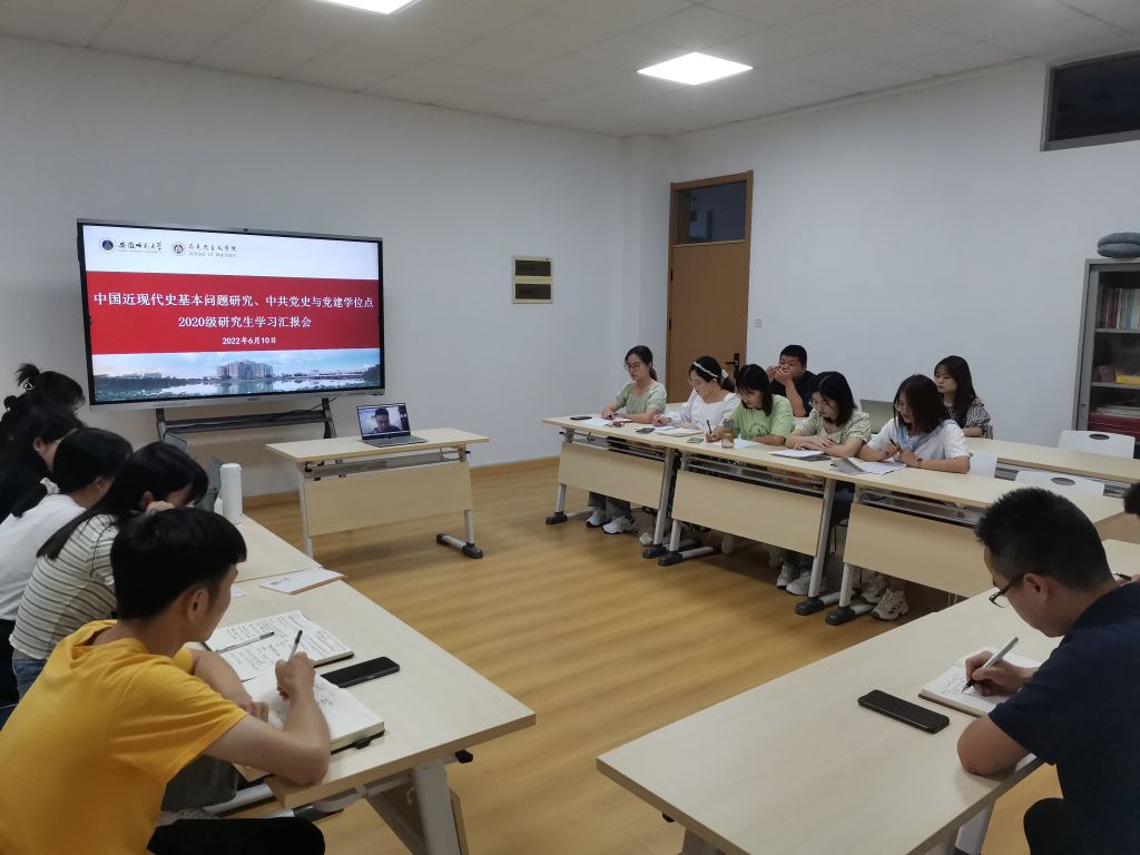 6月10日晚,中国近现代史基本问题研究、中共党史与党建硕士学位点在学苑南楼9号楼107党史教研室共同举办2020级研究生学习汇报会。此次会议由中国近现代史基本问题研究硕士学位点点长崔明海副教授主持,中共党史与党建硕士学位点点长孙亮副教授、学位点王瀛培副教授应邀出席并作点评。学位点2020级全体同学参与学习汇报会。