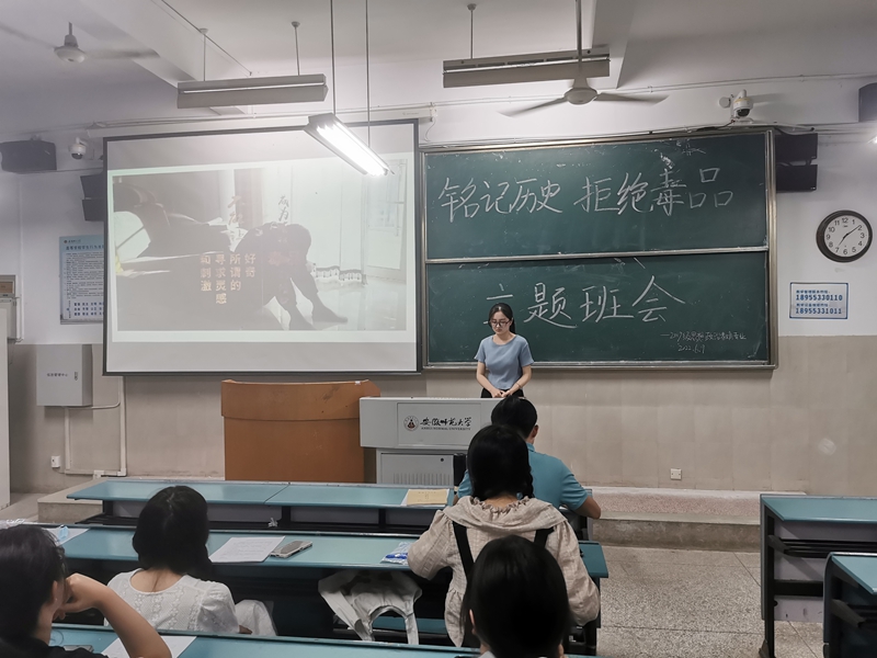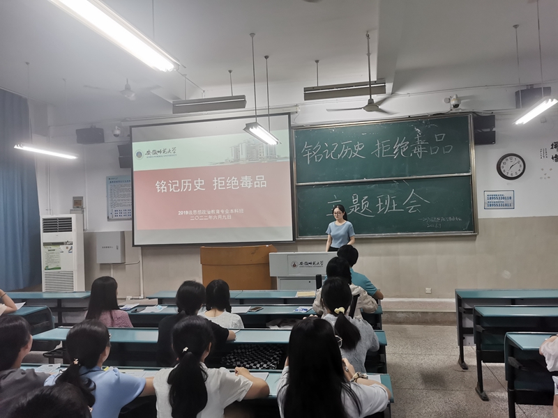 6月9日晚.2019级思想政治教育专业在行知楼2020403教室开展了“铭记历史,拒绝毒品”主题班会。本次班会由生活委员李莉莉主讲,2019级思想政治教育全体本科生参加。