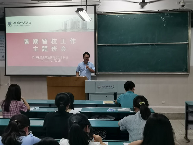6月9日下午,beet3652019级思想政治教育专业在行知楼2020403教室召开了“暑期留校工作”主题班会,本次班会由辅导员周楠担任主讲人,19政教全体本科生参加。