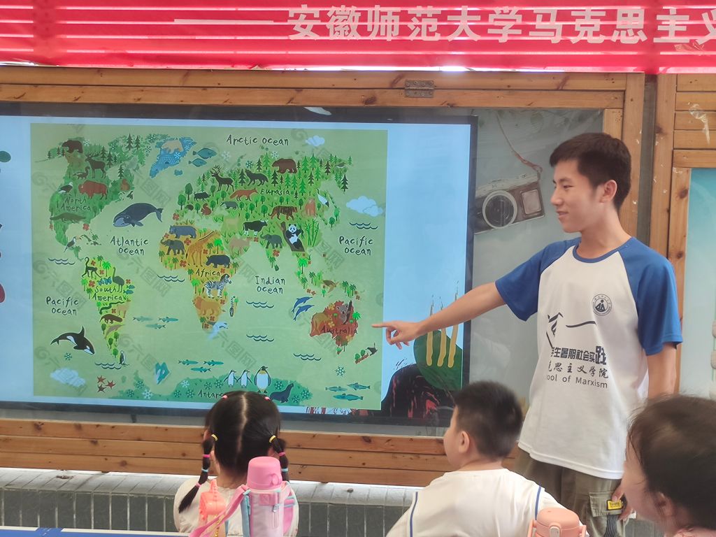 下午3:30,支教团队举办了“世界的和平发展梦”主题活动。志愿者张宇涵从各个大陆上分布的不同动物入手,讲解了基础的世界地理知识。之后由志愿者钱欣彤向小朋友们讲解中国地理的基本知识,她使用和各个省份轮廓相似的动物的图片,帮助社区儿童识记各个省份的形状。授课过程中,小朋友们积极回应,兴致勃勃。讲解完毕,志愿者带领小朋友们完成了世界地图、中国地图的拼图游戏,在游戏中大家更体会到世界是一个整体,和平与发展是全世界的美好愿望。