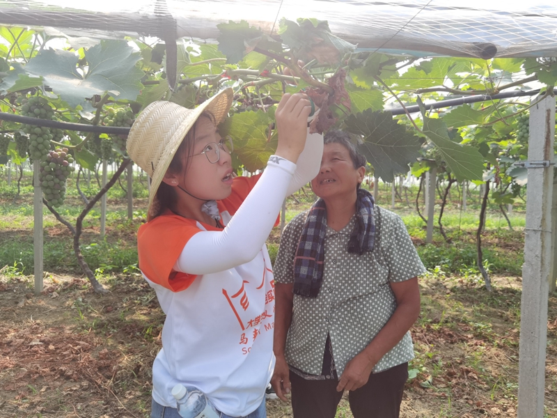 7月1日,团队成员在阜阳市临泉县单桥镇林泉生态园林公司开展劳动活动。跟随负责人王帅和宋筱彤的讲解,团队成员在培育珍稀花木的场地中欣赏奇异品种,学习植物知识。由两位负责人领路,团队成员进到了黄瓜地中,采摘“意中瓜”,走进葡萄园,修剪葡萄藤多余枝叶。乡村振兴并非一时之功,劳动致富才是光明正道。团队成员会将劳动发展放在心间,会把振兴乡村作为使命,继续前行。