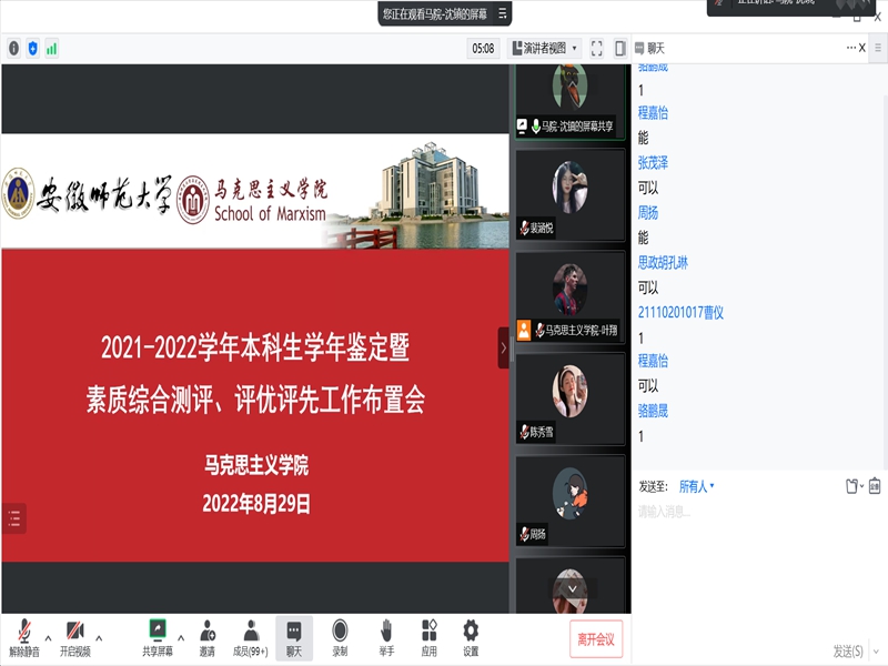 8月29日晚8点,2021级本科生线上召开2021-2022学年本科生学年鉴定暨素质综合测评、评优评先工作布置会,beet3652021级全体员工参会。由辅导员沈镇主持。