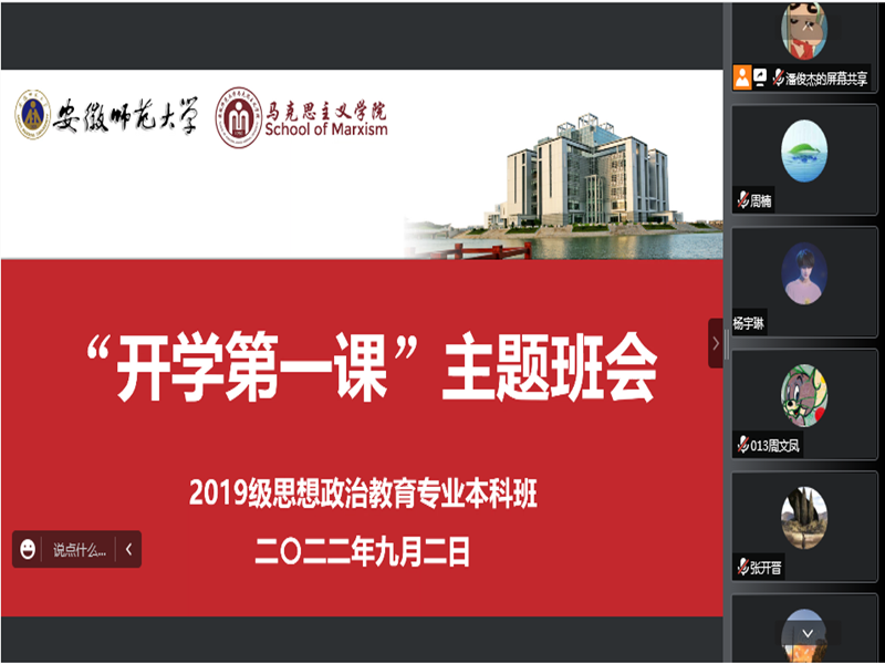 新学期伊始,为激发员工以饱满的精神、奋进的姿态投入新学期的学习和生活中,9月2日下午,2019级思想政治教育专业在线上召开“开学第一课”主题班会。本次班会由辅导员周楠主持,全体同学参加。