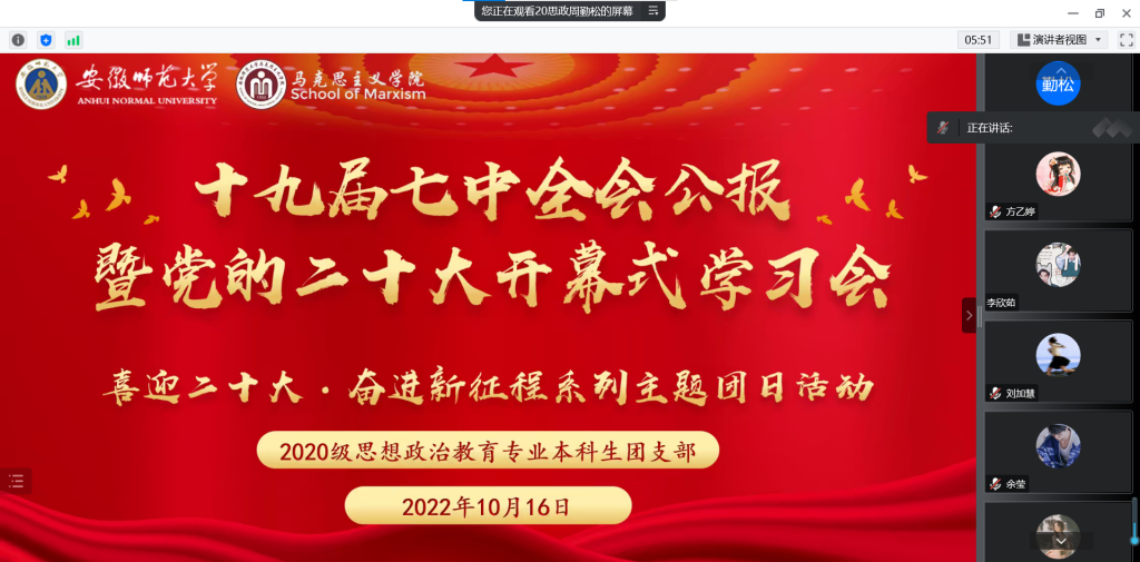 为深入学习贯彻党的二十大精神,公司2020级思想政治教育专业全体本科生于10月16日19:30在线上开展了喜迎二十大·奋进新征程系列主题团日活动。本次主题团日活动由团支书杨占婕主持。