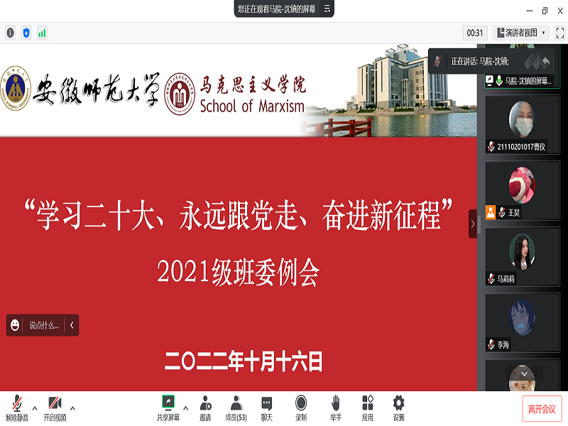 10月16晚,beet3652021级班委召开了主题为“学习二十大、永远跟党走、奋进新征程”的线上班委例会。本次例会由21级辅导员沈镇主持,21级全体班委参加会议。