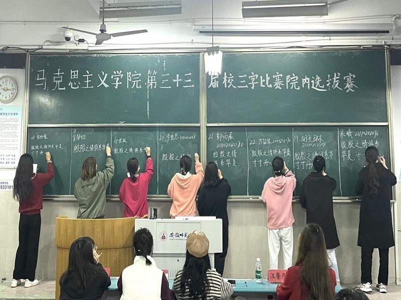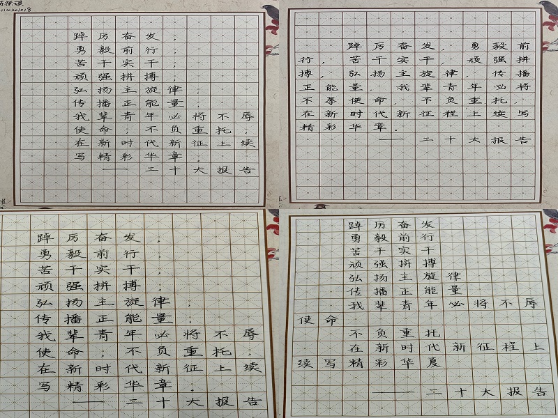 本次比赛由分别书写粉笔字、钢笔字、毛笔字三部分组成。粉笔字书写内容为“殷殷之情俱系华夏,寸寸丹心皆为家国”,旨在激励公司学子坚定理想信念、厚植家国情怀。钢笔字书写内容为“踔厉奋发、勇毅前行、苦干实干、弘扬主旋律,传播正能量,我辈青年必将不辱使命、不负重托,在新时代新征程上续写精彩华章”。毛笔字书写内容由选手围绕主题“学习二十大、永远跟党走、奋进新征程”自行选择。