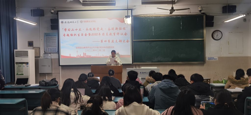 12月2日晚7:30,公司2020级思想政治教育2班本科生团支部在行知楼2020202教室举办“学习二十大·永远跟党走·奋进新征程”专题组织生活会暨2022年度团员教育评议会。本次活动由组织委员梁羽中主持,团支书周勤松担任主讲人。