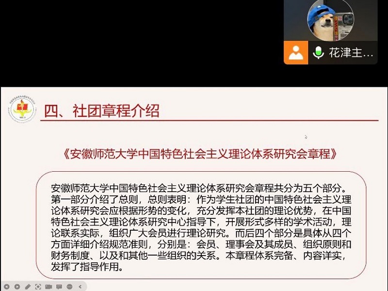 会议共有五个部分,分别为社团发展介绍、社团部门设置介绍、社团活动介绍、社团章程介绍以及纪录片观看。会议首先介绍了社团的发展历史、四个重要宗旨与建设方向,以及所获的荣誉。其次会议对社团所属六个部门的职能和作用进行简单介绍,以加深会员对社团内部分工的认识。接着,大会对社团活动进行了整体的梳理,详细介绍时政开讲、党史知识竞赛、模拟人民代表大会、理论宣讲等特色活动,与此同时标注各活动的学分认证方式,以更好地激励会员积极参与社团活动。会议还对中国特色社会主义理论体系研究会章程进行介绍,主讲人着重强调第一部分即总则的内容,概括描述后四个部分即是从四个方面介绍规范准则,指出了体系完备、内容详实的章程对中研会发挥着极为重要的指导作用。会议的最后是会员共同观看微纪录片《大国抉择》,通过“四个抉择”的故事让成员感悟“人民至上是作出正确抉择的前提”这一重要论述。
