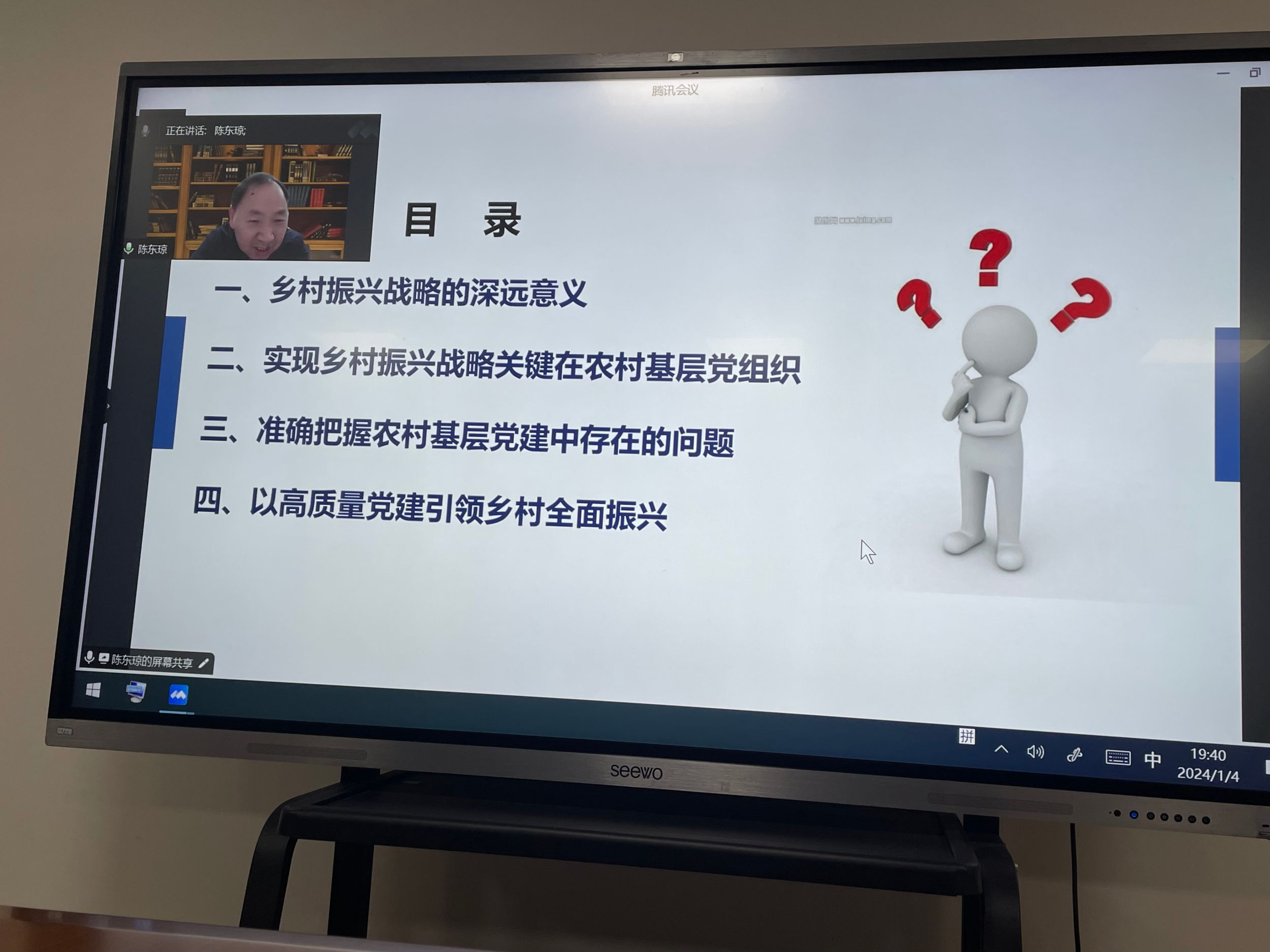 讲座中,陈东琼教授以“抓党建促乡村振兴的理与路”为主题,从乡村振兴战略的深远意义、实现乡村振兴战略关键在农村基层党组织、准确把握农村基层党建中存在的问题、以高质量党建引领乡村全面振兴四个方面展开。他结合习近平总书记关于乡村振兴战略的重要指示和中央对农村工作的战略部署,深刻指出农村基层党组织是实施乡村振兴战略的组织支撑、领导核心,发挥着坚强战斗堡垒的作用,是联系群众的桥梁和纽带,并就目前农村基层党建中存在的各种问题给予了精准对策。在场的同学纷纷表示受益匪浅,收获颇丰。