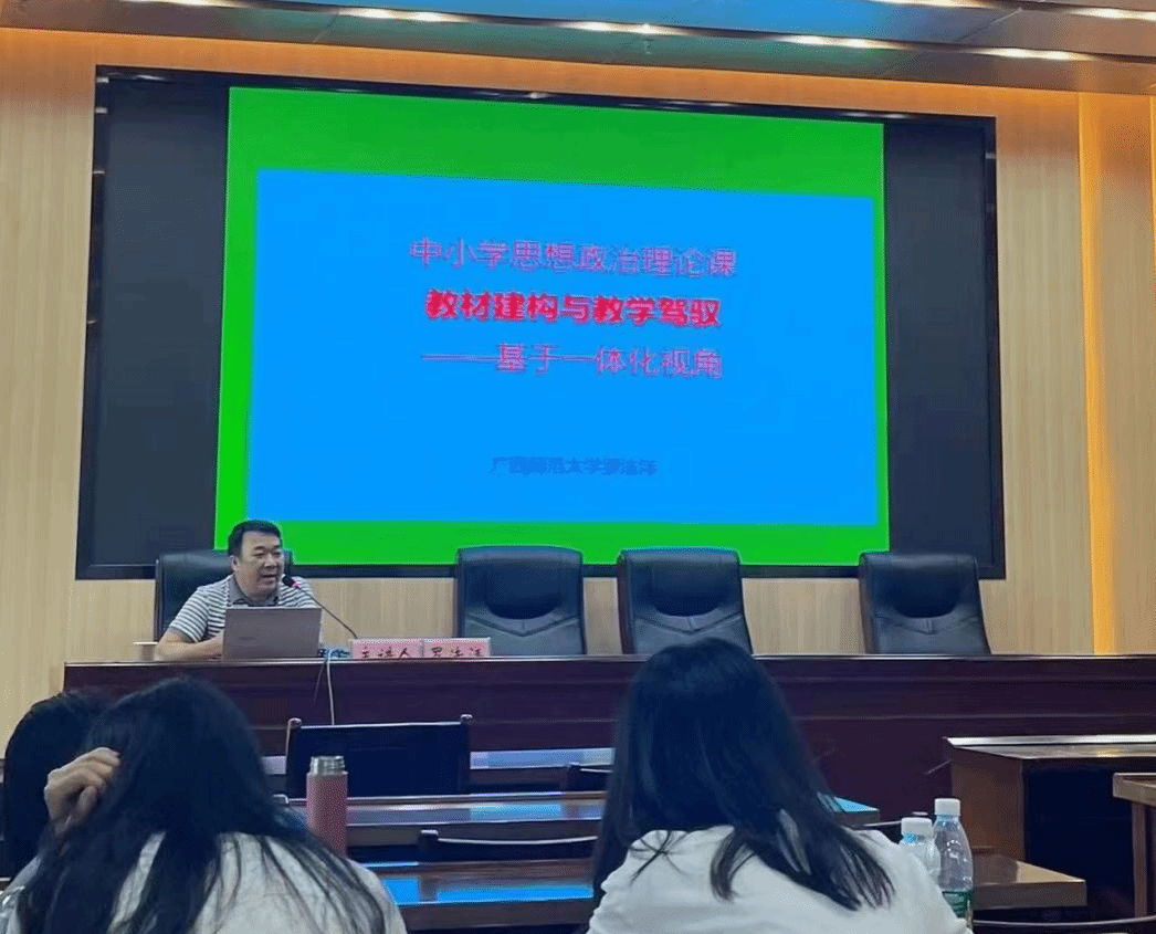 2024年5月17日下午,beet365在花津校区文典楼一楼报告厅举办第57期“思政教育与人才创新”讲堂。广西师范大学罗法洋教授应邀开展学术讲座,题目为:“中小学思想政治理论课教材建构与教学驾驭——基于—体化视角”。讲座由公司陶永华教授主持,公司部分老师和研究生参与学习和研讨。