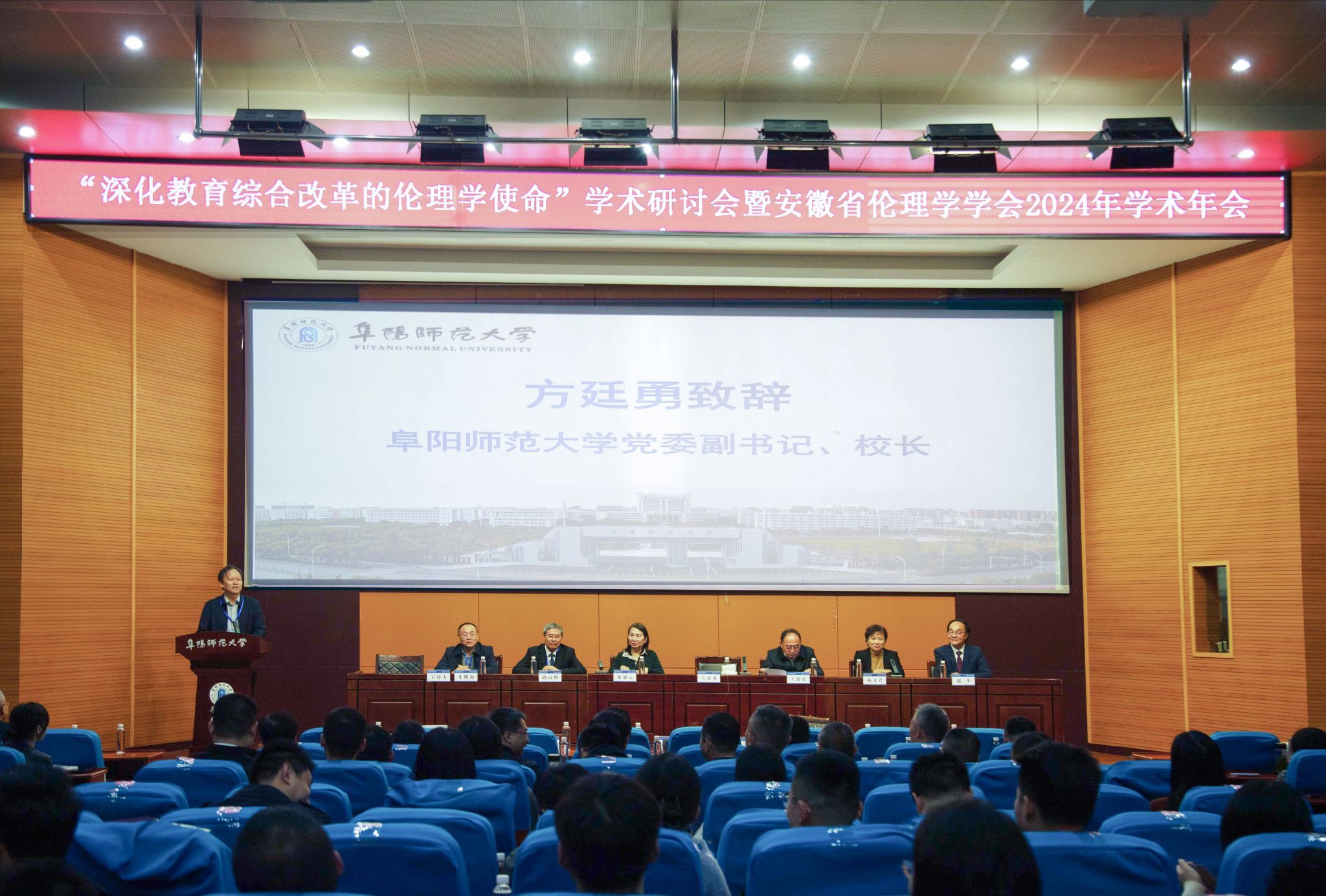 为贯彻落实党的二十大和二十届二中、三中全会精神,深入学习宣传贯彻习近平总书记考察安徽重要讲话精神,用党的创新理论成果推进新时代伦理道德建设,10月19-20日,“深化教育综合改革的伦理学使命”学术研讨会暨安徽省伦理学学会2024年会在阜阳师范大学召开。来自华中师范大学、中南大学、北京信息科技大学、河北大学、西安财经大学、南京航空航天大学、湖北师范大学、安徽大学、beet365官方网站、安徽中医药大学、安庆师范大学、阜阳师范大学等省内外高校及天津社会科公司等科研单位,近百名学者参加了此次盛会。