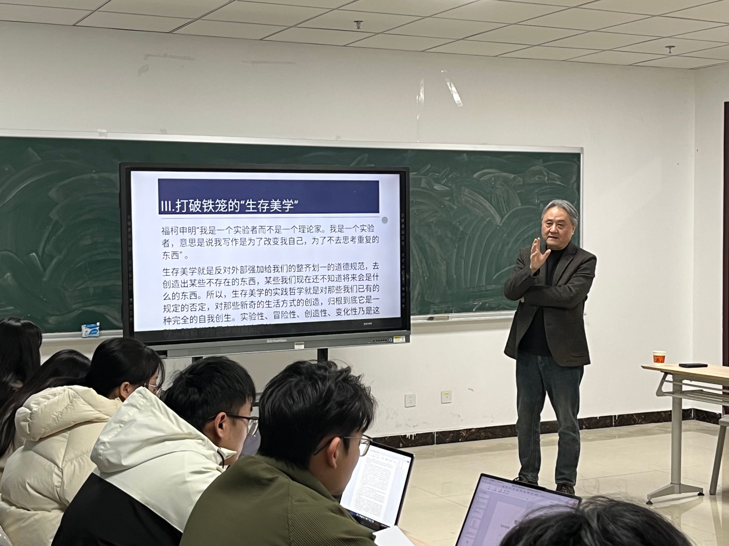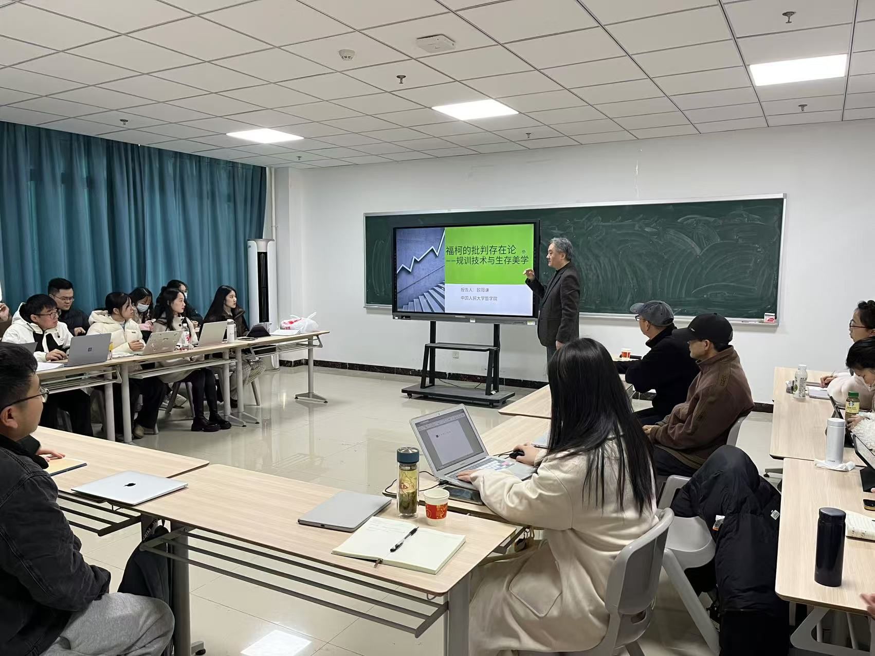 欧阳谦教授从福柯的批判存在论入手,分析了福柯如何继承尼采传统,通过对现代权力机制的追问,揭示了文化规范对主体性的塑造。讲座指出从君主集权到现代规训权力,福柯通过“权力谱系学”分析了监狱、公司、工厂等场域的规训技术如何运作。具体而言,这种“权力的微观物理学”通过纪律、服从和全景敞视主义实现了对个体行为和身体的深刻驯化。欧阳谦教授进一步阐释了福柯哲学后期的核心命题——“生存美学”。福柯追问为什么生命不能变成一件艺术品,他的生存美学倡导一种风格化的生命态度,即将生活作为艺术创造的对象,通过差异化生存与多元共生追求自由的生命实践。这种转向不仅是对规训文化的反思,更是对文化铁笼的突破,为现代主体提供了一种超越性的存在方式。讲座结束后,欧阳谦教授仍与同学们亲切互动,耐心解答大家的疑问。