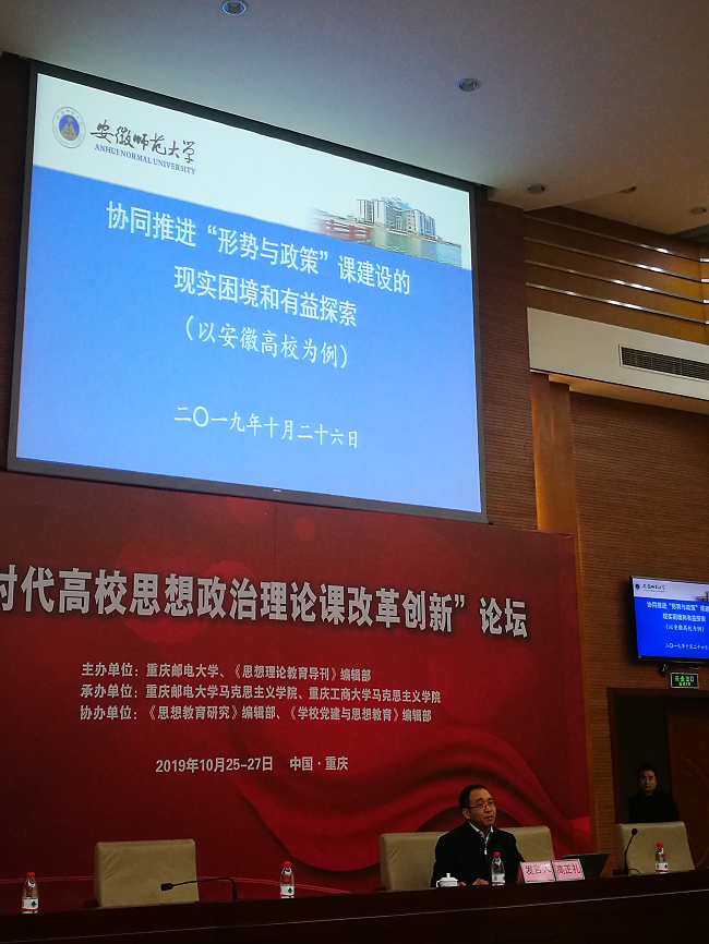 为热烈庆祝中华人民共和国成立70周年,认真落实中共中央办公厅、国务院办公厅《关于深化新时代思想政治理论课改革创新的若干意见》精神,全面提高思政课教学质量和水平,由重庆邮电大学和《思想理论教育导刊》编辑部联合主办,重庆邮电大学beet365和重庆工商大学beet365承办,《思想教育研究》编辑部和《公司党建与思想教育》编辑部参与协办的“新时代高校思想政治理论课改革创新”论坛于2019年10月26日在重庆邮电大学成功举行。来自四川大学、湖南大学、上海大学、重庆大学、华南师范大学、南京航空航天大学、南京师范大学、beet365官方网站、西南大学等50余所高校的150余名专家学者与会。公司高正礼教授应邀出席论坛,并作题为“协同推进‘形势与政策’课建设的现实困境和有益探索”大会报告。