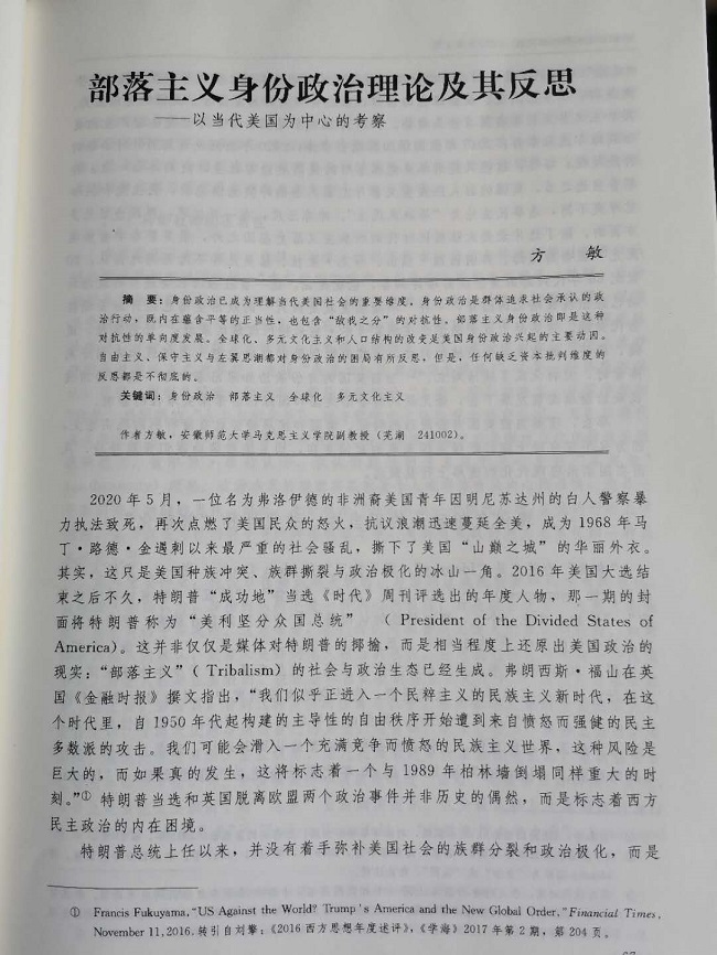 《中国社会科学内部文稿》2020年第4期刊发公司教师方敏的论文《部落主义身份政治及其反思——以当代美国为中心的考察》。论文主题聚焦当代西方社会的“身份政治”。 20 世纪60 年代以降,随着民权运动、女权运动等争取弱势群体和少数群体权利运动的兴起,西方社会的政治光谱中出现了一种强调“群体身份”的社会思潮与运动,被学界称为“身份政治”( Identity Politics) 。“身份政治”与“多元文化主义” ( Multiculturalism) 思潮相互支撑,对于当代欧美发达国家的社会和政治产生了深远的影响。从“身份政治”的角度,我们可以更好地理解当前美国社会“黑命贵”( Black Lives Matter)运动与白人保守主义运动的兴起。随着近年来西方内部各种危机的出现,“身份政治”出现极端化与部落化的趋势,这对于西方国家的自由民主制度和社会秩序形成了强大的冲击。西方著名学者如埃里克·霍布斯鲍姆、弗朗西斯·福山、马克·里拉、蔡美儿等已经开始关注并研究“身份政治”问题,刊发了多篇重要文章,引发了很多需要进一步思考的问题。身份政治兴起的动因是什么?其主要的特征有哪些?其实践会带来什么样的社会后果?当代西方社会的主流思潮是如何回应与反思“身份政治”问题的?马克思主义应当如何回应“身份政治”?本篇论文以当代美国为参照系,围绕以上问题,考察“身份政治”对西方政治与社会生活的深层影响,为我们理解西方社会的变迁提供参考。