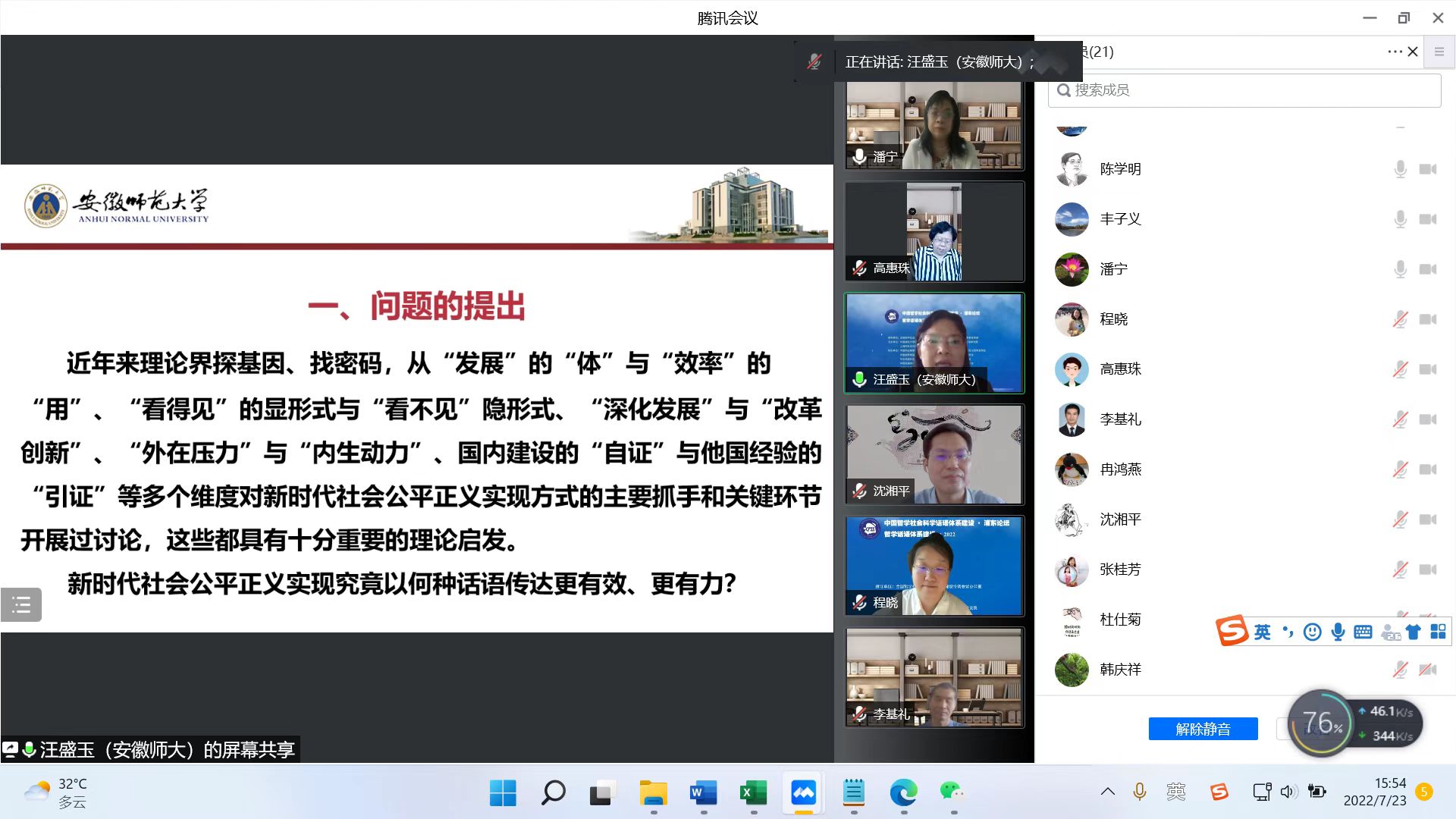 汪盛玉教授应会议邀请在“2022浦东论坛——中国人学学会分论坛”做了题为《以人民为中心的公平正义话语建构》的会议发言。她在发言中指出,以人民为中心的公平正义话语,在实质上是“人民性公平正义”的理论共识和价值取向,其核心内涵是为社会发展成果惠及全体人民提供理论支持和智慧力量。以人民为中心的公平正义话语建构,是持续推进社会公平正义理论创新和实践创新相统一的重要工作,需要在“抓源头”话语建构、“探因由”话语建构、“控过程”话语建构、“治末端”话语建构等各个层面共同发力。她的会议发言受到了与会学者的关注和赞赏。