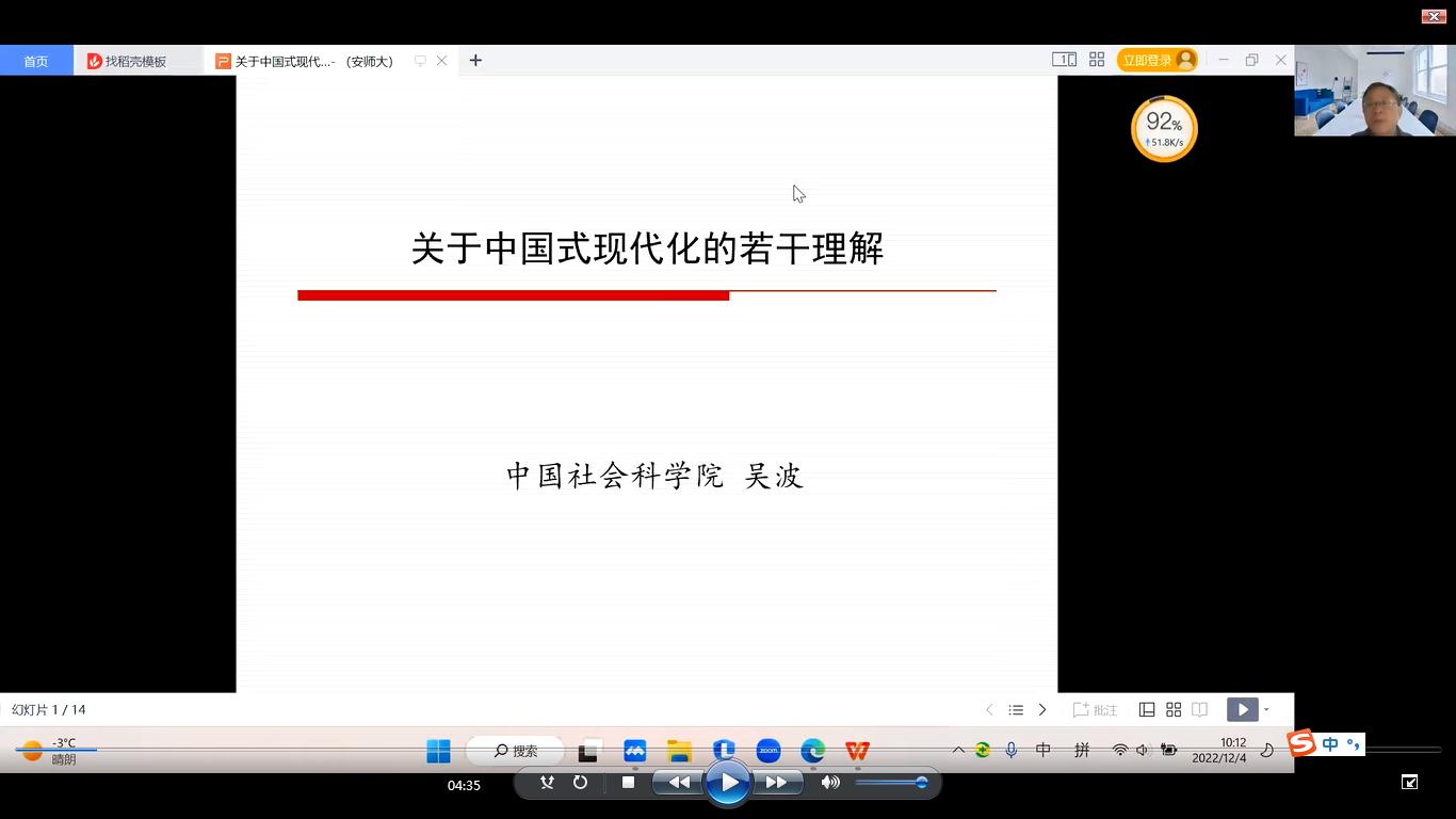 中国社会科公司研究员吴波以关于中国式现代化的若干理解为主题,梳理了中国式现代化相关概念的历史演变进程,总结了习近平总书记关于中国式现代化的相关论述,并从“大党的独有难题”出发,就马克思主义政党在执政条件下如何保持自身先进性和纯洁性提出看法。