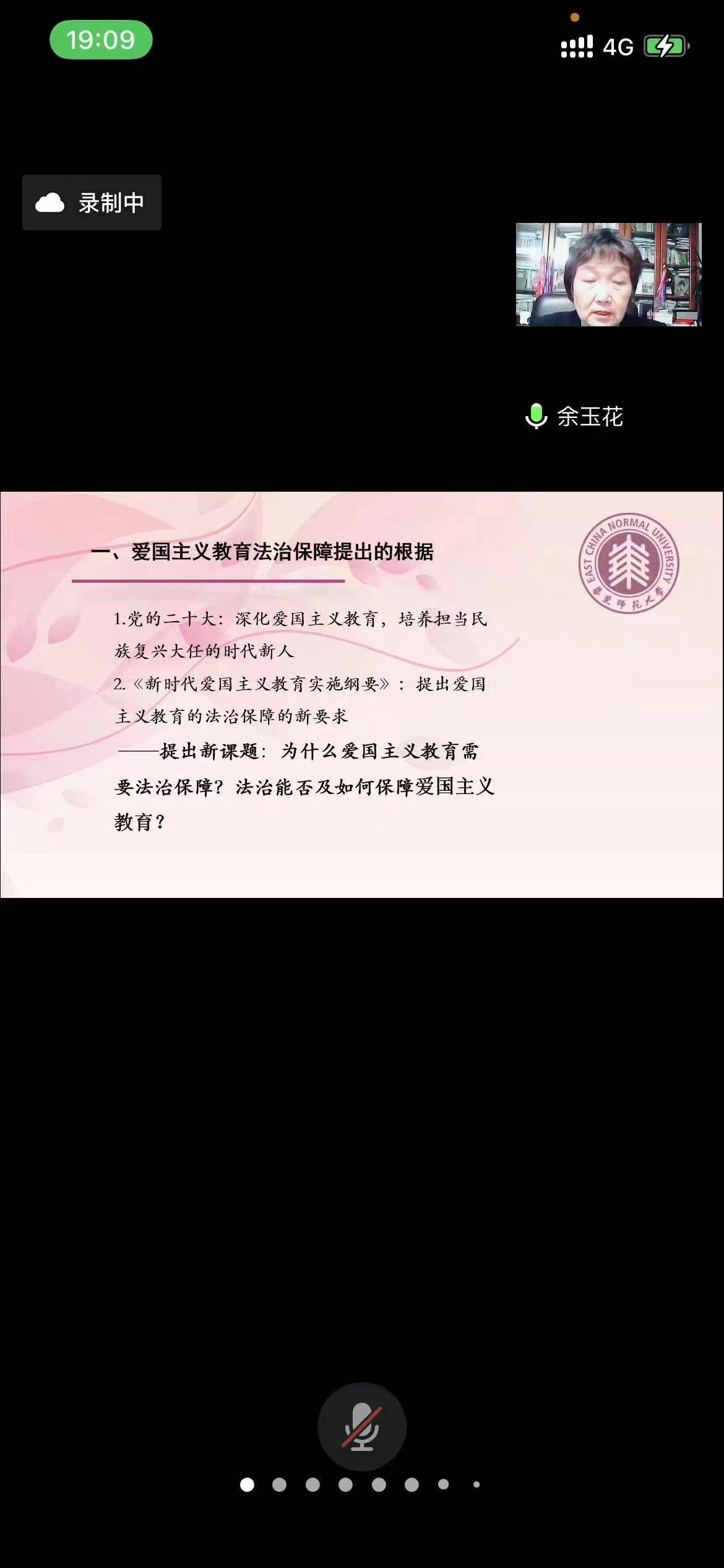 华东师范大学教授余玉花以爱国主义教育的立法保障为主题,探讨爱国主义教育与法治保障之间的关联。从“为什么爱国主义教育需要法治保障”、“法治能否及如何保障爱国主义教育”两个问题出发,指出法治保障爱国主义教育的意义,她认为新时代爱国主义教育的战略部署中包括了对爱国主义教育的法治保障,她提出从“立法保障”和“执法保障”两方面提出了爱国主义教育实施的有效措施。
