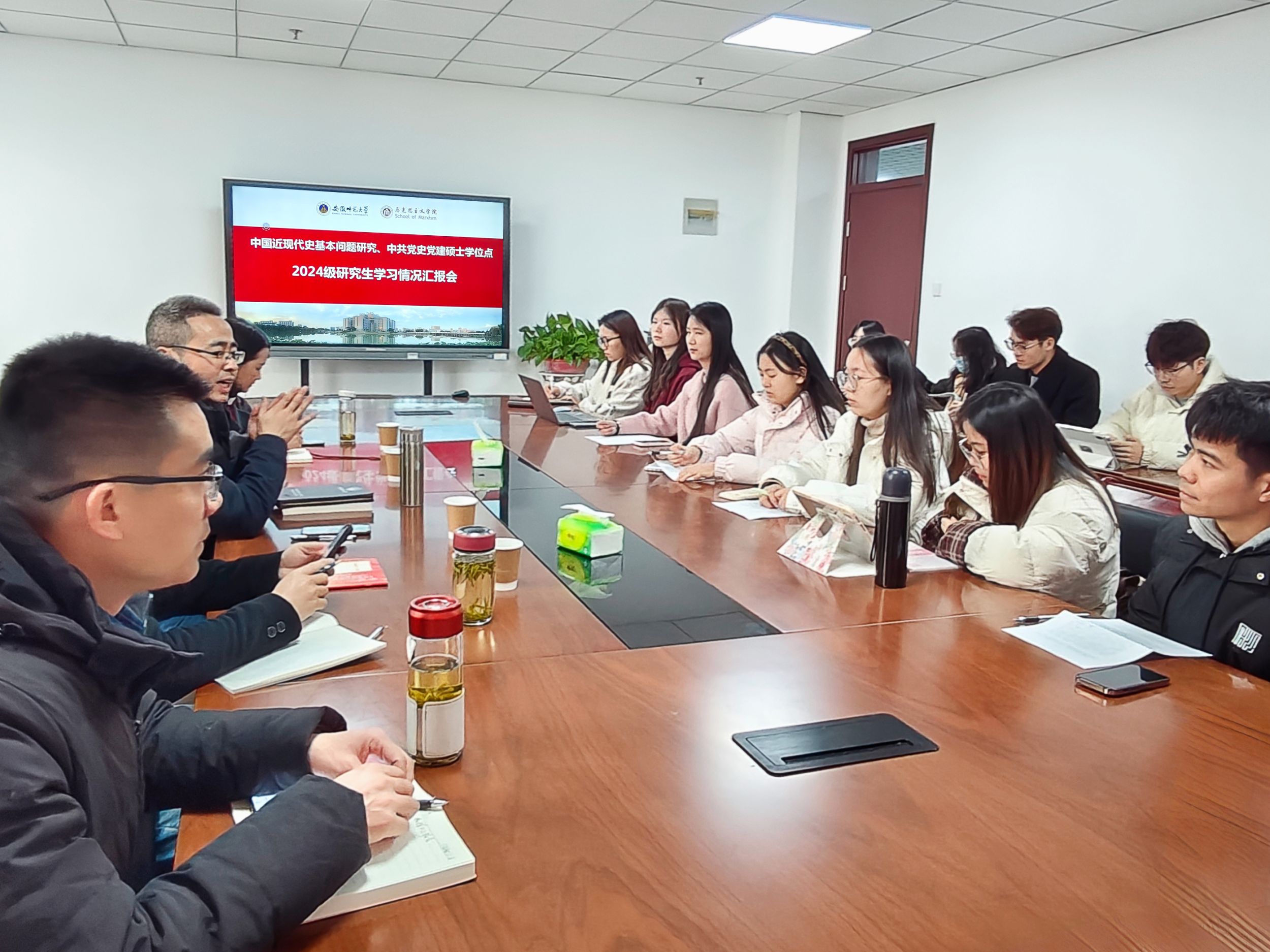 为深入了解2024级研究生学习状况,促进师生交流,落实公司产品过程性考核工作,1月3日下午,中国近现代史基本问题研究、中共党史党建学位点在文典楼G211会议室举行2024级研究生学习情况汇报会,学位点导师佘君教授、孙亮教授、崔明海副教授、孔卫拿副教授出席指导,2024级全体研究生参加汇报会。