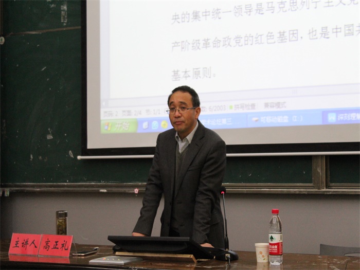 本次讲座由服务部理事赵丹阳主持,首先她向各位观众简单介绍了高正礼的基本情况,让大家有初步认识。紧接着讲座开始,高正礼从三个方面来讲述他关于论争马克思主义的形成与发展的观点,还特别巧妙的运用民主革命时期马克思主义中国化中的论争以及邓小平“论争”与“不论争”的思想展开论述,并指出之所以会产生论争是由于中西方文化在表达方式及知识储备方面的差异造成的马克思主义文化的晦涩难懂。紧接着选取民主革命时期的两个阶段——国民革命时期、抗日战争时期来分析马克思主义中国化论争的原因及影响。最后高正礼例举邓小平对于“论争”与“不论争”的具体要求,再次强调论争对于马克思主义中国化的重要性。高正礼将深奥的道理简单化,使得在场的各位同学都对马克思主义及它在中国的运用和发展有了基本的了解,同时高正礼在传授知识之际还推荐了很多相关书籍以便大家课余学习研究。